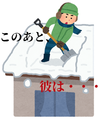 →天井部分が崩壊して埋まってしまったが、幸い自力で脱出できました。屋根の雪下ろしをしているときに、積もった雪と一緒に落下したこと。